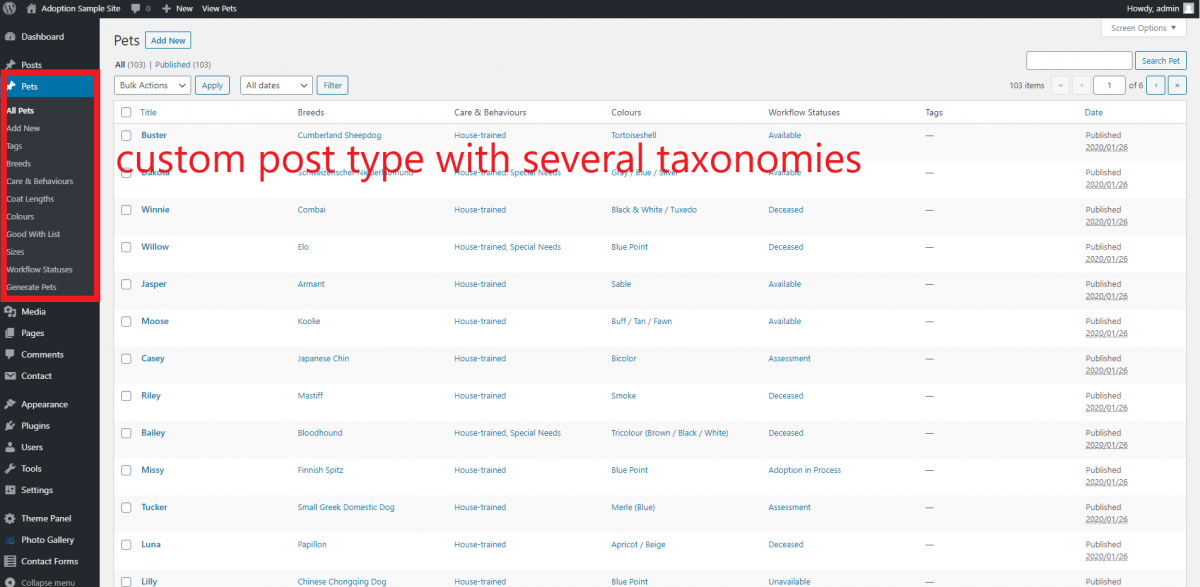 - custom post type “pet” with with meta data fields and taxonomies for breed, size, coat length, care & behaviour, coat colour, and good with list